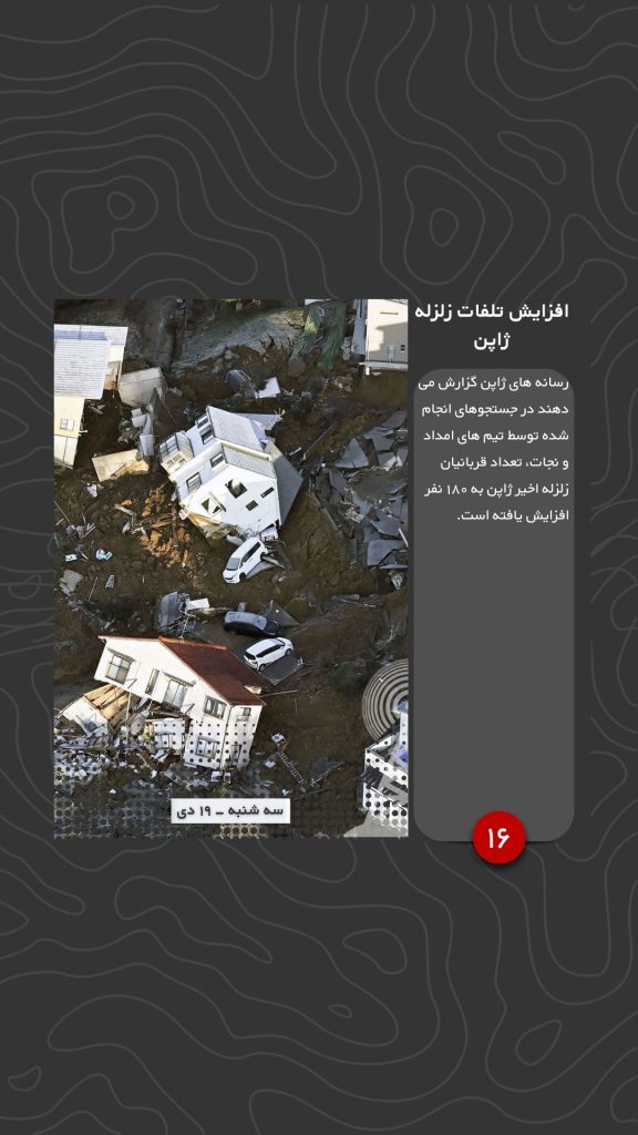رسانه های ژاپن گزارش می دهند در جستجوهای انجام شده توسط تیم های امداد و نجات، تعداد قربانیان زلزله اخیر ژاپن به ۱۸۰ نفر افزایش یافته است.