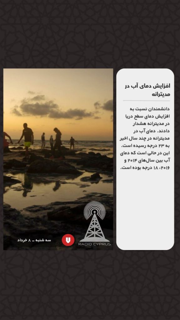 دانشمندان نسبت به افزایش دمای سطح دریا در مدیترانه هشدار دادند. دمای آب در مدیترانه در چند سال اخیر به ۲۳ درجه رسیده است. این در حالی است که دمای آب بین سال‌های ۲۰۱۴ و ۲۰۱۶، ۱۸ درجه بوده است.
