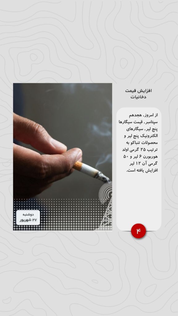 از امروز, هجدهم سپتامبر, قیمت سیگارها پنج لیر, سیگارهای الکترونیک پنج لیر و محصولات تنباکو به ترتیب ۲۵ گرمی اولد هوربورن ۶ لیر و ۵۰ گرمی آن ۱۲ لیر افزایش یافته است.