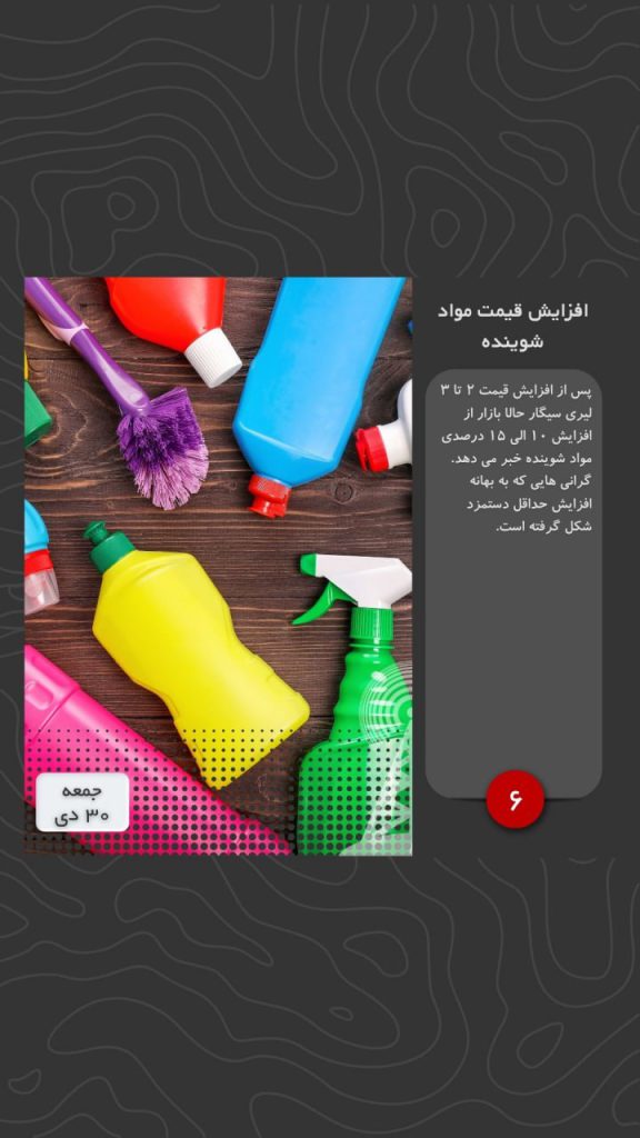 پس از افزایش قیمت ۲ تا ۳ لیری سیگار حالا بازار از افزایش ۱۰ الی ۱۵ درصدی مواد شوینده خبر می دهد. گرانی هایی که به بهانه افزایش حداقل دستمزد شکل گرفته است.