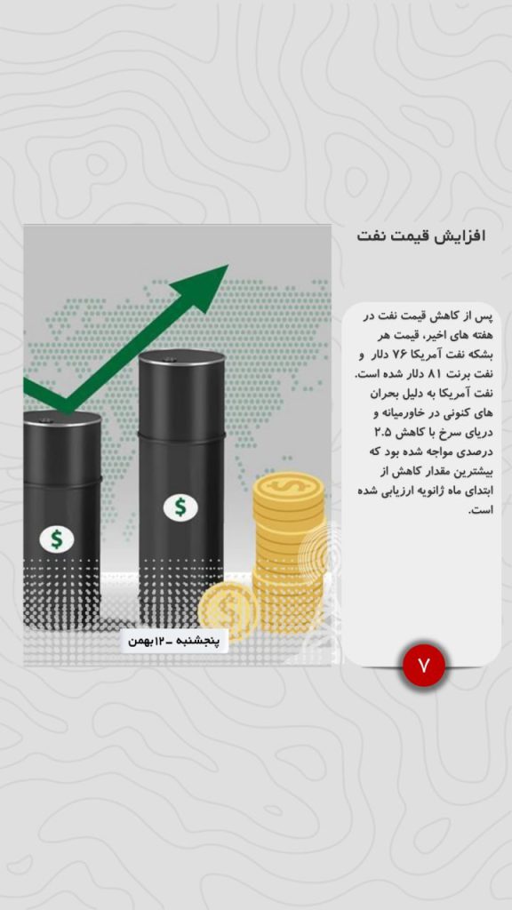 پس از کاهش قیمت نفت در هفته های اخیر، قیمت هر بشکه نفت آمریکا ۷۶ دلار و نفت برنت ۸۱ دلار شده است. نفت آمریکا به دلیل بحران های کنونی در خاورمیانه و دریای سرخ با کاهش ۲.۵ درصدی مواجه شده بود که بیشترین مقدار کاهش از ابتدای ماه ژانویه ارزیابی شده است.