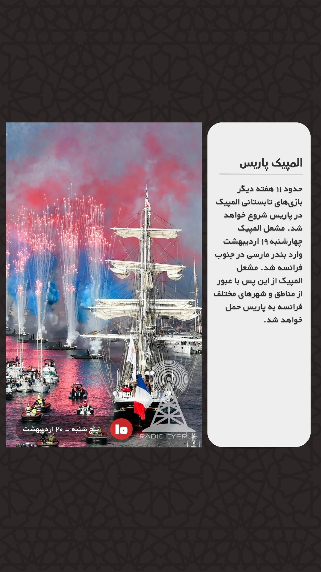 حدود ۱۱ هفته دیگر بازیهای تابستانی المپیک در پاریس شروع خواهد شد. مشعل المپیک چهارشنبه ۱۹ اردیبهشت وارد بندر مارسی در جنوب فرانسه شد. مشعل المپیک از این پس با عبور از مناطق و شهرهای مختلف فرانسه به پاریس حمل خواهد شد.