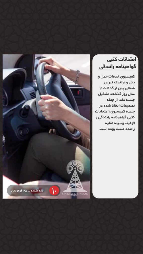 کمیسیون خدمات حمل و نقل و ترافیک قبرس شمالی پس از گذشت ۳ سال روز گذشته تشکیل جلسه داد. از جمله تصمیمات اتخاذ شده در جلسه کمیسیون؛ امتحانات کتبی گواهینامه رانندگی و توقیف وسیله نقلیه راننده مست بوده است.