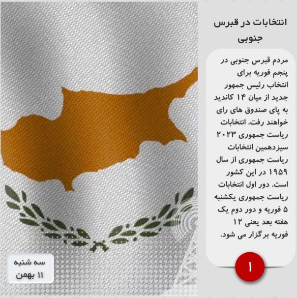مردم قبرس جنوبی در پنجم فوریه برای انتخاب رئیس جمهور جدید از میان ۱۴ کاندید به پای صندوق های رای خواهند رفت. انتخابات ریاست جمهوری ۲۰۲۳ سیزدهمین انتخابات ریاست جمهوری از سال ۱۹۵۹ در این کشور است. دور اول انتخابات ریاست جمهوری یکشنبه ۵ فوریه و دور دوم یک هفته بعد یعنی ۱۲ فوریه برگزار می شود.