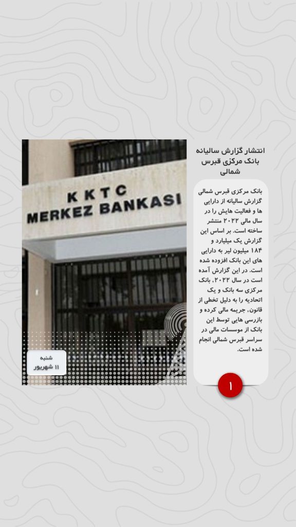 بانک مرکزی قبرس شمالی گزارش سالیانه از دارایی ها و فعالیت هایش را در سال مالی ۲۰۲۲ منتشر ساخته است. بر اساس این گزارش یک میلیارد و ۱۸۴ میلیون لیر به دارایی های این بانک افزوده شده است. در این گزارش آمده است در سال ۲۰۲۲, بانک مرکزی سه بانک و یک اتحادیه را به دلیل تخطی از قانون, جریمه مالی کرده و بازرسی هایی توسط این بانک از موسسات مالی در سراسر قبرس شمالی انجام شده است.
