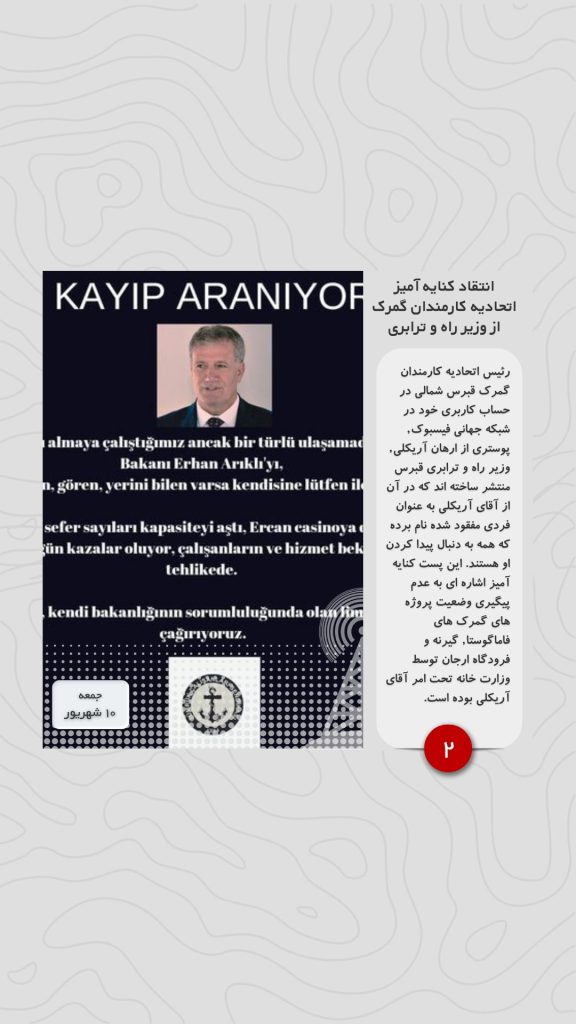 رئیس اتحادیه کارمندان گمرک قبرس شمالی در حساب کاربری خود در شبکه جهانی فیسبوک, پوستری از ارهان آریکلی, وزیر راه و ترابری قبرس منتشر ساخته اند که در آن از آقای آریکلی به عنوان فردی مفقود شده نام برده که همه به دنبال پیدا کردن او هستند. این پست کنایه آمیز اشاره ای به عدم پیگیری وضعیت پروژه های گمرک های فاماگوستا, گیرنه و فرودگاه ارجان توسط وزارت خانه تحت امر آقای آریکلی بوده است.