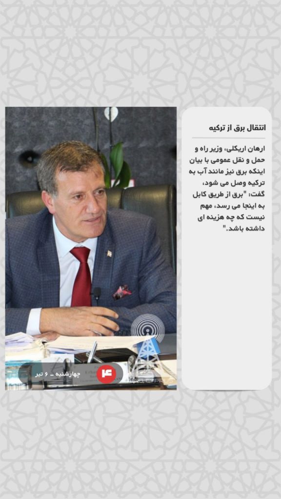 ارهان اریکلی، وزیر راه و حمل و نقل عمومی با بیان اینکه برق نیز مانند آب به ترکیه وصل می شود، گفت: “برق از طریق کابل به اینجا می رسد، مهم نیست که چه هزینه ای داشته باشد.”