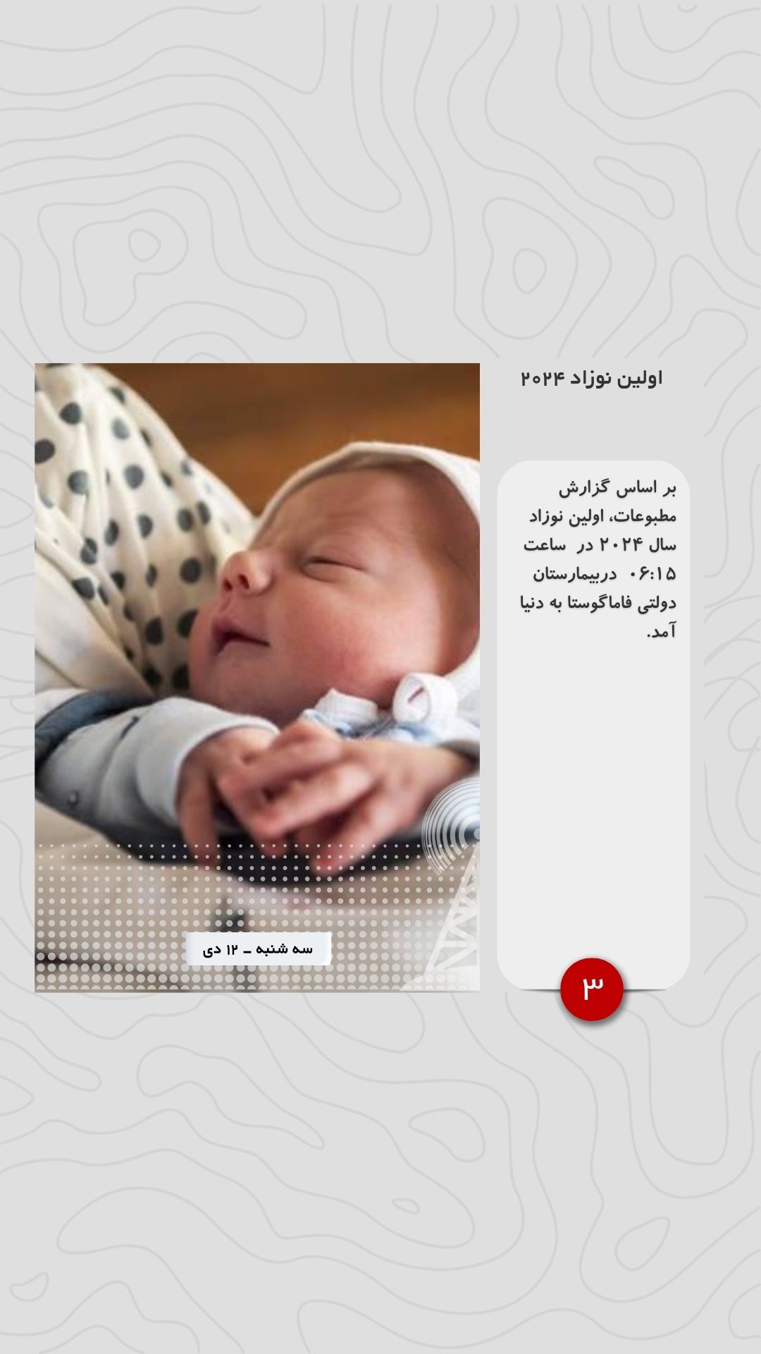 بر اساس گزارش مطبوعات، اولین نوزاد سال ۲۰۲۴ در ساعت ۰۶:۱۵ دربیمارستان دولتی فاماگوستا به دنیا آمد.