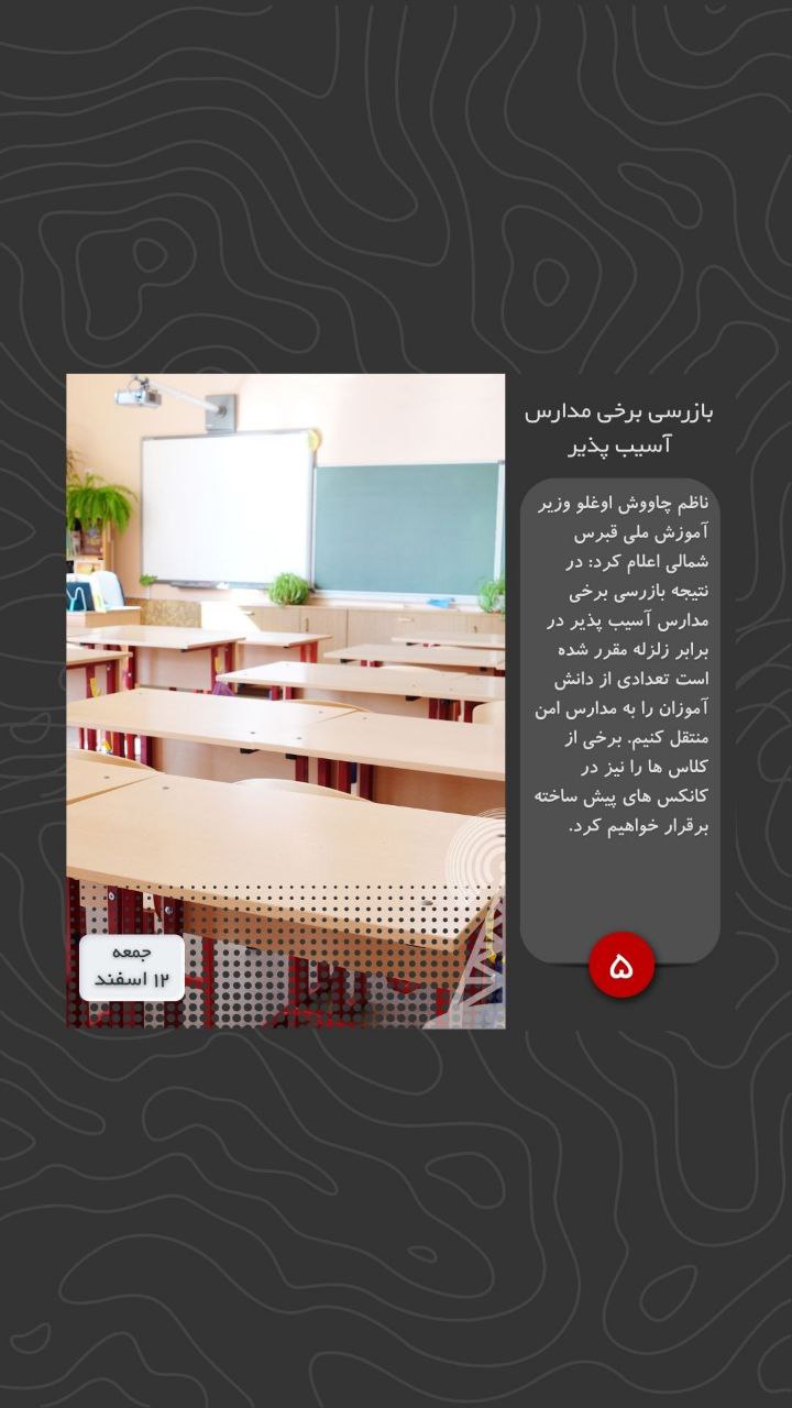 ناظم چاووش اوغلو وزیر آموزش ملی قبرس شمالی اعلام کرد: در نتیجه بازرسی برخی مدارس آسیب پذیر در برابر زلزله مقرر شده است تعدادی از دانش آموزان را به مدارس امن منتقل کنیم. برخی از کلاس ها را نیز در کانکس های پیش ساخته برقرار خواهیم کرد.