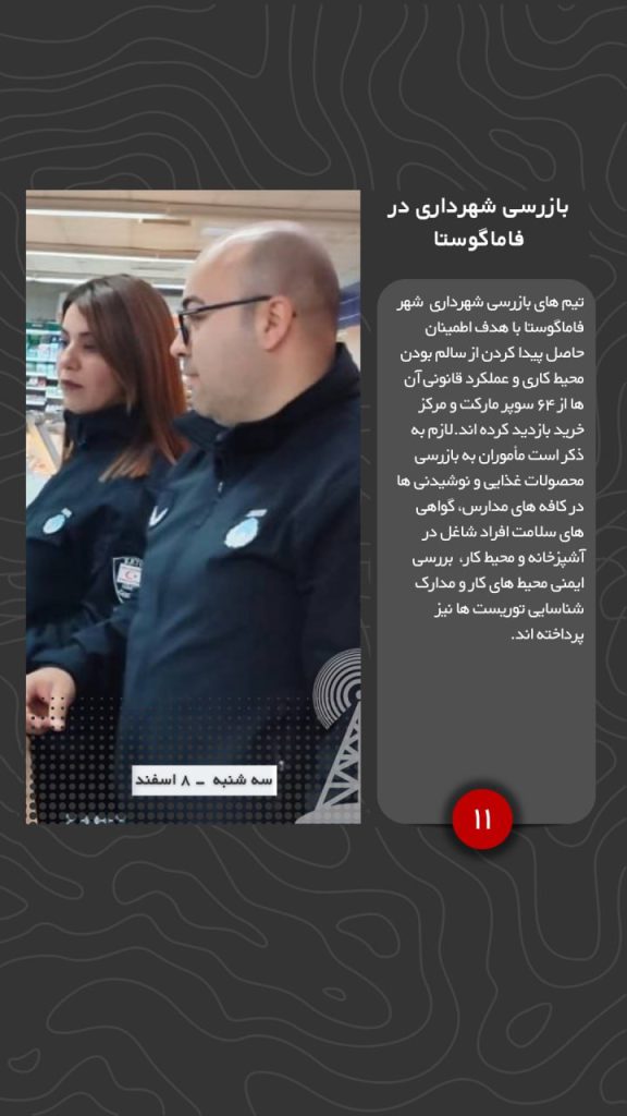تیم های بازرسی شهرداری شهر فاماگوستا با هدف اطمینان حاصل پیدا کردن از سالم بودن محیط کاری و عملکرد قانونی آن ها از ۶۴ سوپر مارکت و مرکز خرید بازدید کرده اند.لازم به ذکر است مأموران به بازرسی محصولات غذایی و نوشیدنی ها در کافه های مدارس، گواهی های سلامت افراد شاغل در آشپزخانه و محیط کار، بررسی ایمنی محیط های کار و مدارک شناسایی توریست ها نیز پرداخته اند.