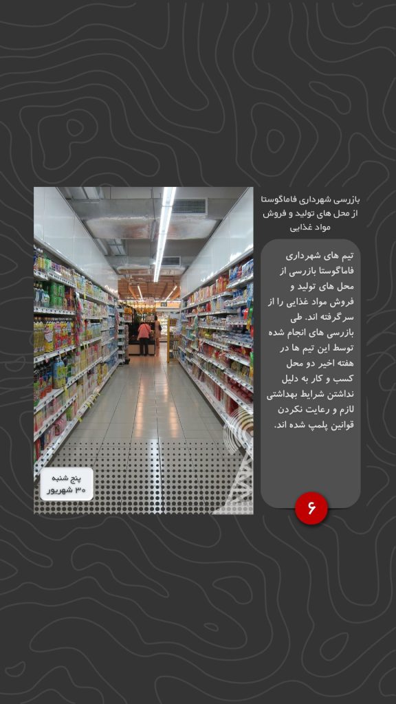 تیم های شهرداری فاماگوستا بازرسی از محل های تولید و فروش مواد غذایی را از سرگرفته اند. طی بازرسی های انجام شده توسط این تیم ها در هفته اخیر دو محل کسب و کار به دلیل نداشتن شرایط بهداشتی لازم و رعایت نکردن قوانین پلمپ شده اند.