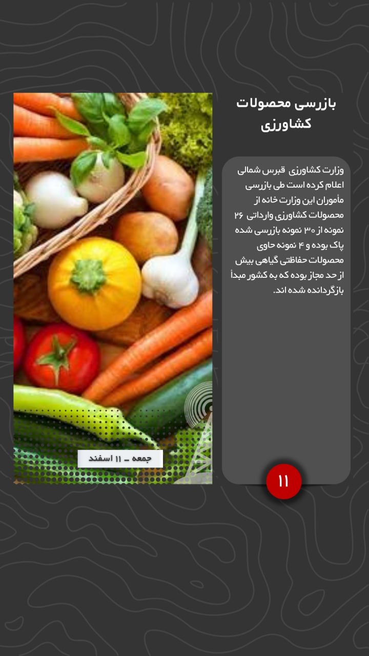 وزارت کشاورزی قبرس شمالی اعلام کرده است طی بازرسی مأموران این وزارت خانه از محصولات کشاورزی وارداتی ۲۶ نمونه از ۳۰ نمونه بازرسی شده پاک بوده و ۴ نمونه حاوی محصولات حفاظتی گیاهی بیش از حد مجاز بوده که به کشور مبدأ بازگردانده شده اند.