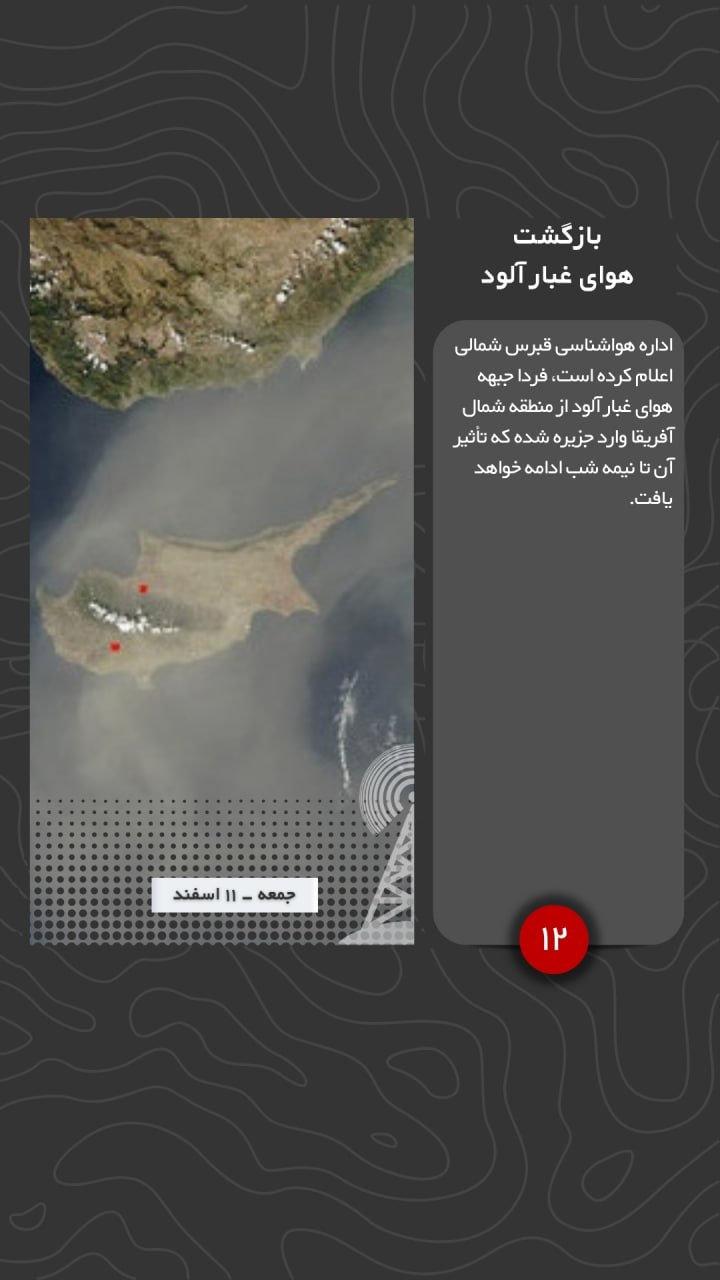 اداره هواشناسی قبرس شمالی اعلام کرده است، فردا جبهه هوای غبار آلود از منطقه شمال آفریقا وارد جزیره شده که تأثیر آن تا نیمه شب ادامه خواهد یافت.