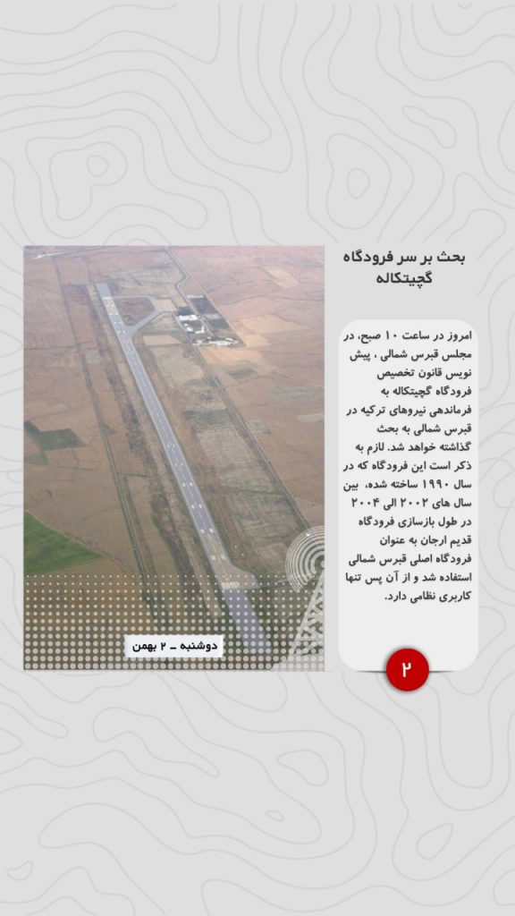 امروز در ساعت ۱۰ صبح، در مجلس قبرس شمالی ، پیش نویس قانون تخصیص فرودگاه گچیتکاله به فرماندهی نیروهای ترکیه در قبرس شمالی به بحث گذاشته خواهد شد. لازم به ذکر است این فرودگاه که در سال ۱۹۹۰ ساخته شده، بین سال های ۲۰۰۲ الی ۲۰۰۴ در طول بازسازی فرودگاه قدیم ارجان به عنوان فرودگاه اصلی قبرس شمالی استفاده شد و از آن پس تنها کاربری نظامی دارد.