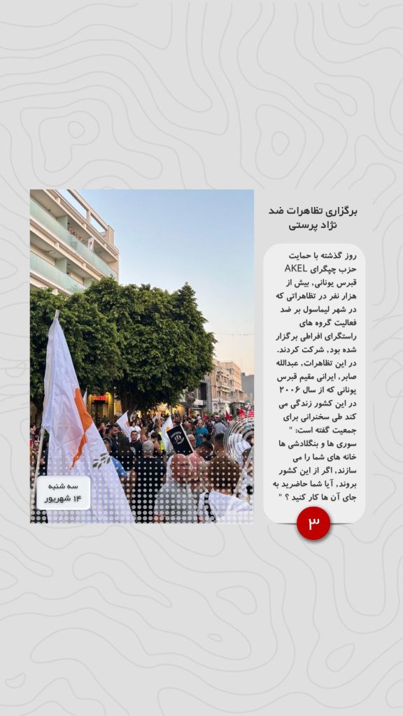 روز گذشته با حمایت حزب چپگرای AKEL قبرس یونانی, بیش از هزار نفر در تظاهراتی که در شهر لیماسول بر ضد فعالیت گروه های راستگرای افراطی برگزار شده بود, شرکت کردند. در این تظاهرات, عبدالله صابر, ایرانی مقیم قبرس یونانی که از سال ۲۰۰۶ در این کشور زندگی می کند طی سخنرانی برای جمعیت گفته است: ” سوری ها و بنگلادشی ها خانه های شما را می سازند, اگر از این کشور بروند, آیا شما حاضرید به جای آن ها کار کنید ؟ “