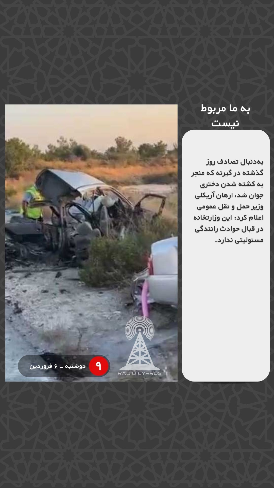 به‌دنبال تصادف روز گذشته در گیرنه که منجر به کشته شدن دختری جوان شد، ارهان آریکلی وزیر حمل و نقل عمومی اعلام کرد: این وزارتخانه در قبال حوادث رانندگی مسئولیتی ندارد.