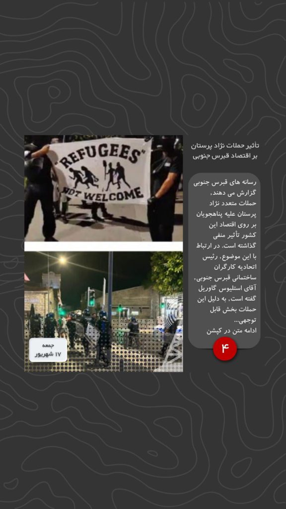 رسانه های قبرس جنوبی گزارش می دهند, حملات متعدد نژاد پرستان علیه پناهجویان بر روی اقتصاد این کشور تأثیر منفی گذاشته است. در ارتباط با این موضوع, رئیس اتحادیه کارگران ساختمانی قبرس جنوبی, آقای استلیوس گاوریل گفته است, به دلیل این حملات بخش قابل توجهی از کارگران ساختمانی که اتباع خارجی هستند, دست از کار کشیده اند که منجر به تعلیق برخی از پروژه های ساختمانی و عمرانی شده است.