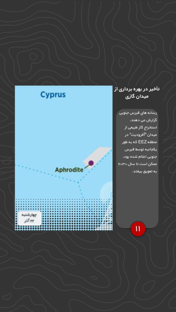 رسانه های قبرس جنوبی گزارش می دهند، استخراج گاز طبیعی از میدان “آفرودیت” در منطقه EEZ که به طور یکجانبه توسط قبرس جنوبی اعلام شده بود، ممکن است تا سال ۲۰۳۰ به تعویق بیفتد.