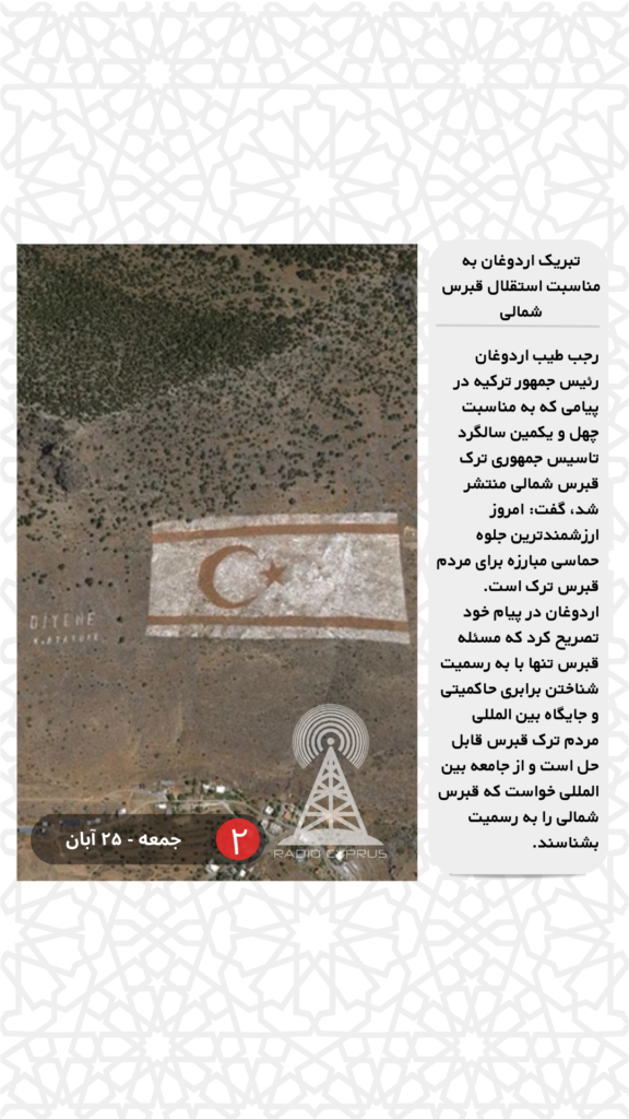 رجب طیب اردوغان رئیس جمهور ترکیه در پیامی که به مناسبت چهل و یکمین سالگرد تاسیس جمهوری ترک قبرس شمالی منتشر شد، گفت: امروز ارزشمندترین جلوه حماسی مبارزه برای مردم قبرس ترک است. اردوغان در پیام خود تصریح کرد که مسئله قبرس تنها با به رسمیت شناختن برابری حاکمیتی و جایگاه بین المللی مردم ترک قبرس قابل حل است و از جامعه بین المللی خواست که قبرس شمالی را به رسمیت بشناسند.