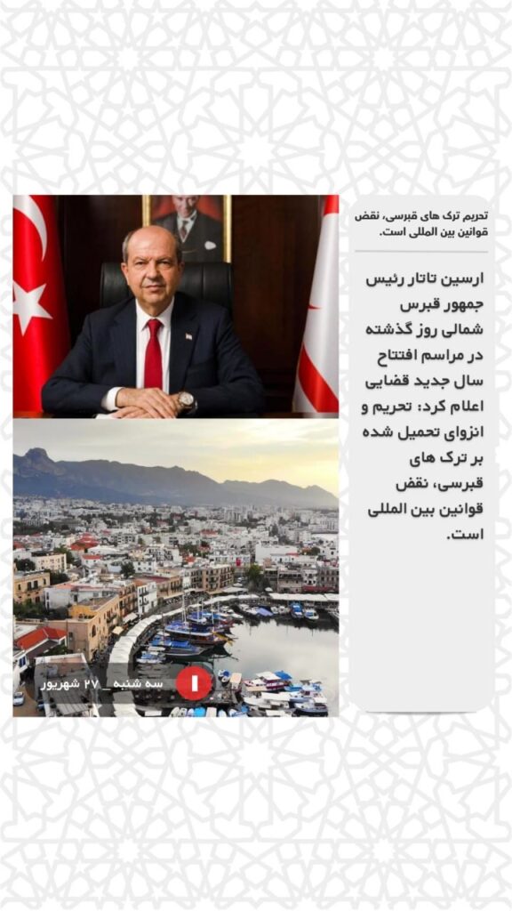 ارسین تاتار رئیس جمهور قبرس شمالی روز گذشته در مراسم افتتاح سال جدید قضایی اعلام کرد: تحریم و انزوای تحمیل شده بر ترک های قبرسی، نقض قوانین بین المللی است.