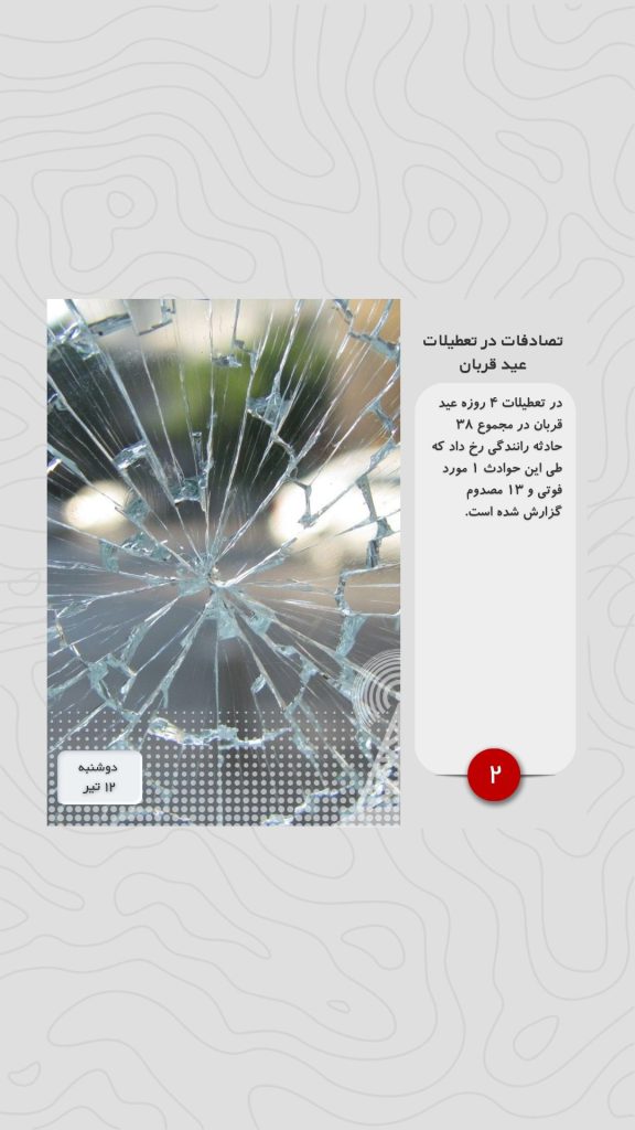 در تعطیلات ۴ روزه عید قربان در مجموع ۳۸ حادثه رانندگی رخ داد که طی این حوادث ۱ مورد فوتی و ۱۳ مصدوم گزارش شده است.