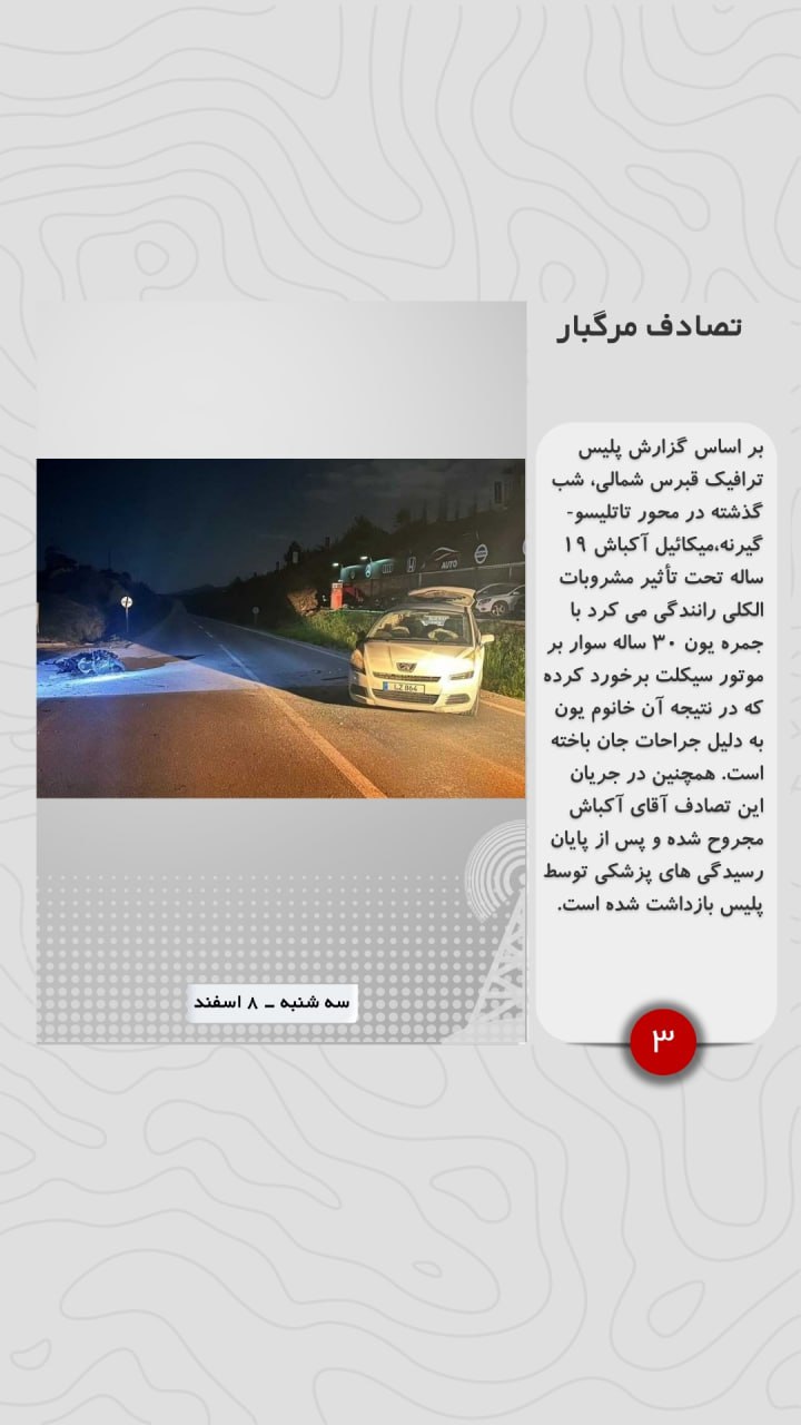 بر اساس گزارش پلیس ترافیک قبرس شمالی، شب گذشته در محور تاتلیسو-گیرنه،میکائیل آکباش ۱۹ ساله تحت تأثیر مشروبات الکلی رانندگی می کرد با جمره یون ۳۰ ساله سوار بر موتور سیکلت برخورد کرده که در نتیجه آن خانوم یون به دلیل جراحات جان باخته است. همچنین در جریان این تصادف آقای آکباش مجروح شده و پس از پایان رسیدگی های پزشکی توسط پلیس بازداشت شده است.