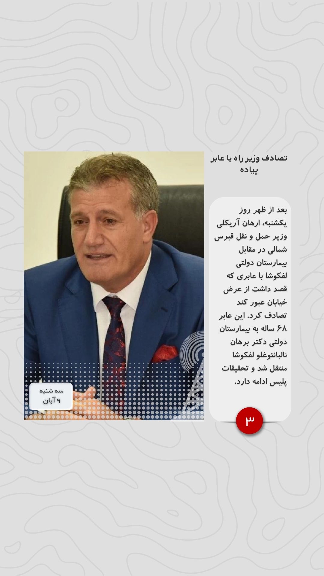 بعد از ظهر روز یکشنبه، ارهان آریکلی وزیر حمل و نقل قبرس شمالی در مقابل بیمارستان دولتی لفکوشا با عابری که قصد داشت از عرض خیابان عبور کند تصادف کرد. این عابر ۶۸ ساله به بیمارستان دولتی دکتر برهان نالبانتوغلو لفکوشا منتقل شد و تحقیقات پلیس ادامه دارد.