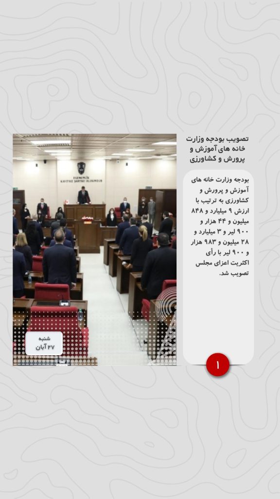 بودجه وزارت خانه های آموزش و پرورش و کشاورزی به ترتیب با ارزش ۹ میلیارد و ۸۴۸ میلیون و ۴۴ هزار و ۹۰۰ لیر و ۳ میلیارد و ۲۸ میلیون و ۹۸۳ هزار و ۹۰۰ لیر با رأی اکثریت اعزای مجلس تصویب شد.