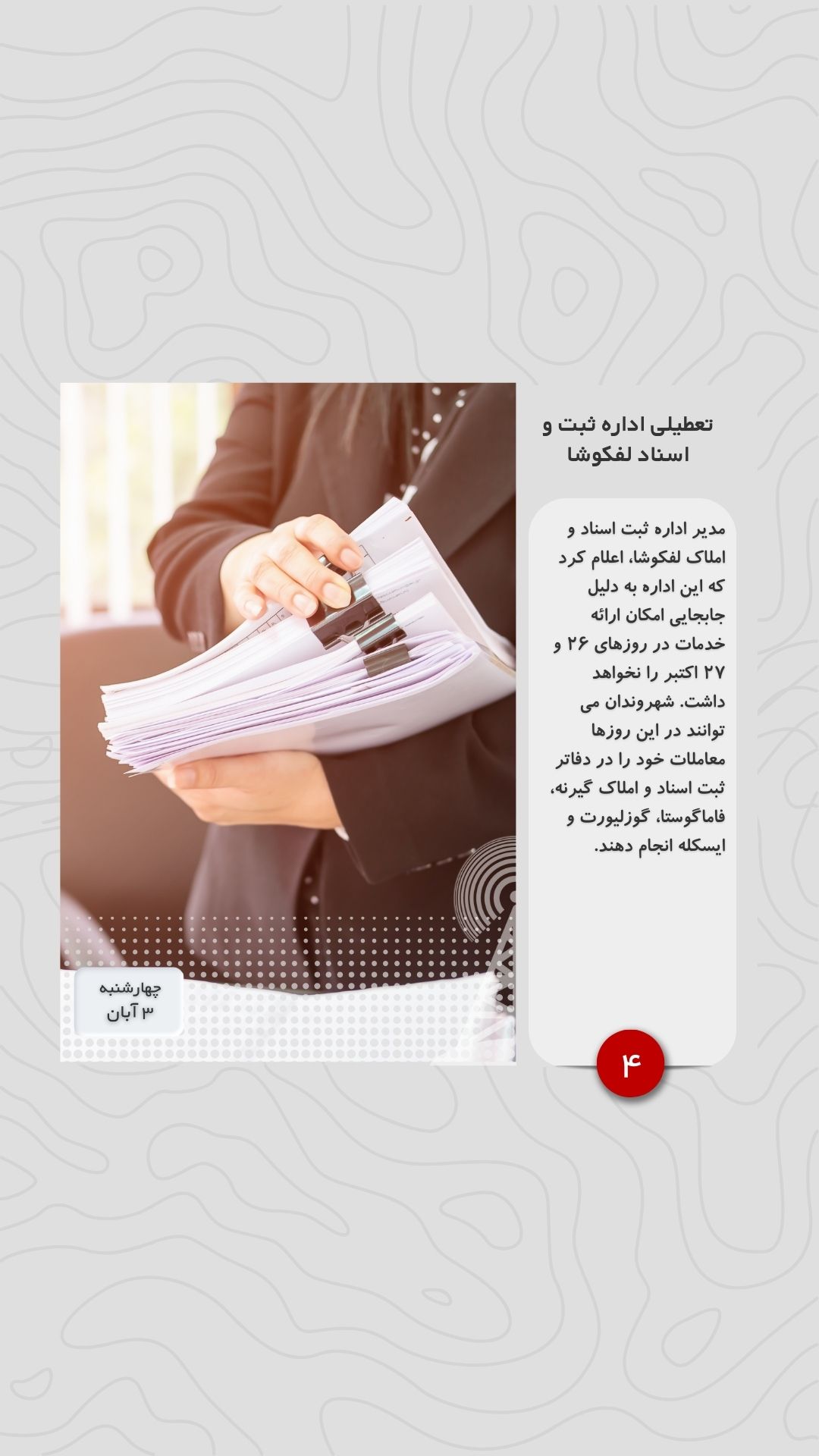 مدیر اداره ثبت اسناد و املاک لفکوشا، اعلام کرد که این اداره به دلیل جابجایی امکان ارائه خدمات در روزهای ۲۶ و ۲۷ اکتبر را نخواهد داشت. شهروندان می توانند در این روزها معاملات خود را در دفاتر ثبت اسناد و املاک گیرنه، فاماگوستا، گوزلیورت و ایسکله انجام دهند.