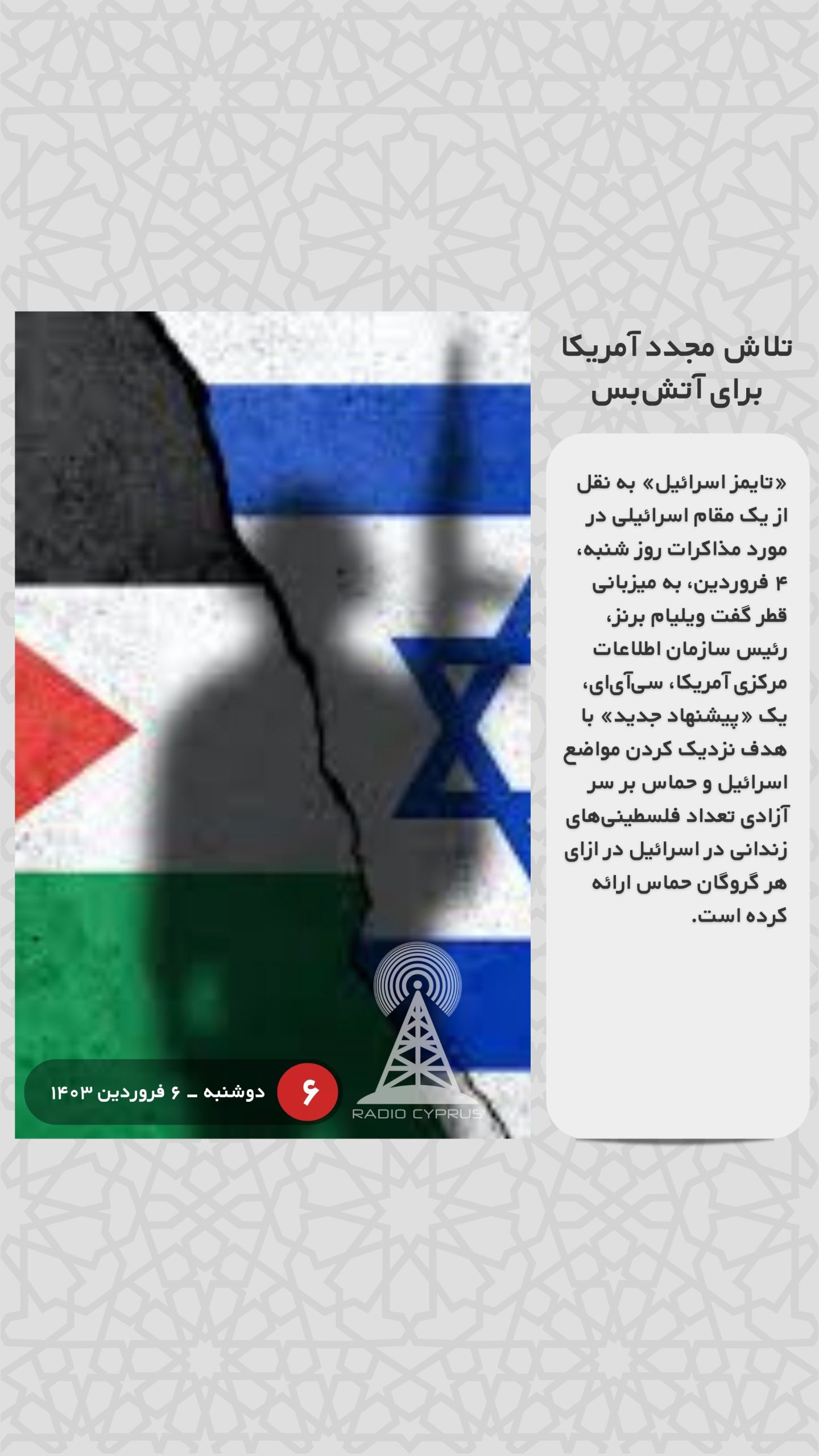 «تایمز اسرائیل» به نقل از یک مقام اسرائیلی در مورد مذاکرات روز شنبه، ۴ فروردین، به میزبانی قطر گفت ویلیام برنز، رئیس سازمان اطلاعات مرکزی آمریکا، سیآیای، یک «پیشنهاد جدید» با هدف نزدیک کردن مواضع اسرائیل و حماس بر سر آزادی تعداد فلسطینیهای زندانی در اسرائیل در ازای هر گروگان حماس ارائه کرده است.