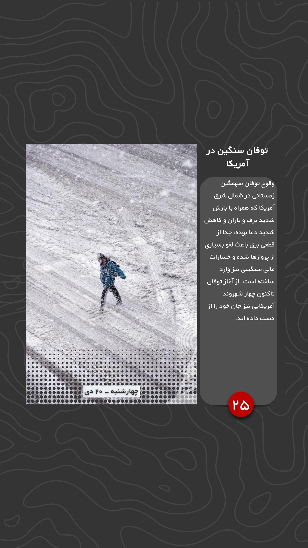 وقوع توفان سهمگین زمستانی در شمال شرق آمریکا که همراه با بارش شدید برف و باران و کاهش شدید دما بوده، جدا از قطعی برق باعث لغو بسیاری از پروازها شده و خسارات مالی سنگینی نیز وارد ساخته است. از آغاز توفان تاکنون چهار شهروند آمریکایی نیز جان خود را از دست داده اند.