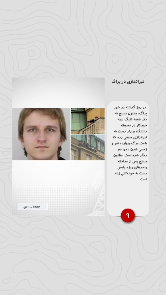 .در روز گذشته در شهر پراگ، مظنون مسلح به یک قبضه تفنگ نیمه خودکار در محوطه دانشگاه چارلز دست به تیراندازی جمعی زده که باعث مرگ چهارده نفر و زخمی شدن دهها نفر دیگر شده است. مظنون مسلح پس از مداخله واحدهای ویژه پلیس دست به خودکشی زده است.