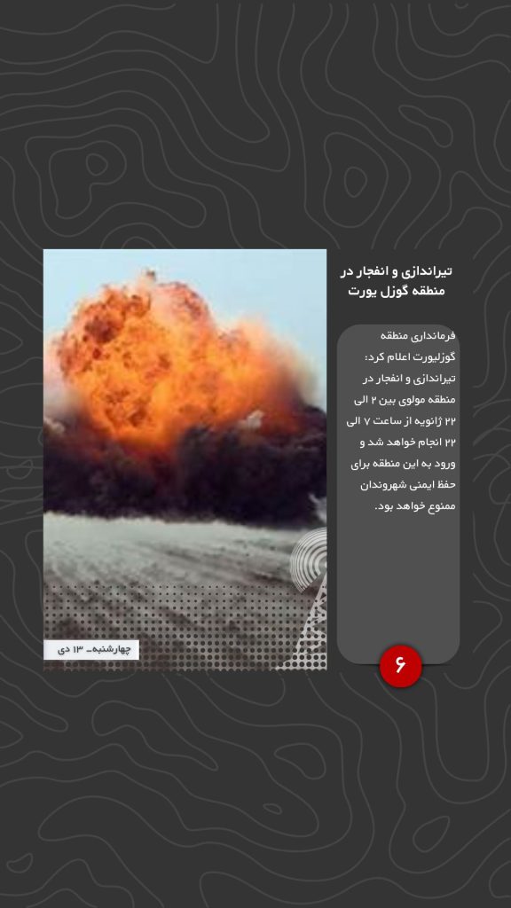 فرمانداری منطقه گوزلیورت اعلام کرد: تیراندازی و انفجار در منطقه مولوی بین ۲ الی ۲۲ ژانویه از ساعت ۷ الی ۲۲ انجام خواهد شد و ورود به این منطقه برای حفظ ایمنی شهروندان ممنوع خواهد بود.