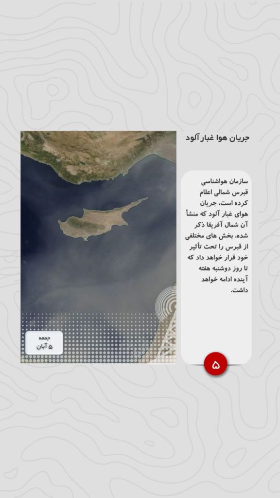 سازمان هواشناسی قبرس شمالی اعلام کرده است، جریان هوای غبار آلود که منشأ آن شمال آفریقا ذکر شده، بخش های مختلفی از قبرس را تحت تأثیر خود قرار خواهد داد که تا روز دوشنبه هفته آینده ادامه خواهد داشت.