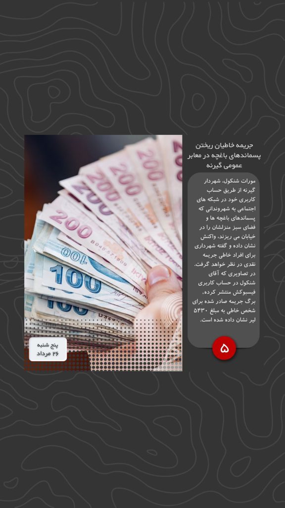مورات شنکول، شهردار گیرنه از طریق حساب کاربری خود در شبکه های اجتماعی به شهروندانی که پسماندهای باغچه ها و فضای سبز منزلشان را در خیابان می ریزند، واکنش نشان داده و گفته شهرداری برای افراد خاطی جریمه نقدی در نظر خواهد گرفت. در تصاویری که آقای شنکول در حساب کاربری فیسبوکش منتشر کرده, برگ جریمه صادر شده برای شخص خاطی به مبلغ ۵۴۳۰ لیر نشان داده شده است.