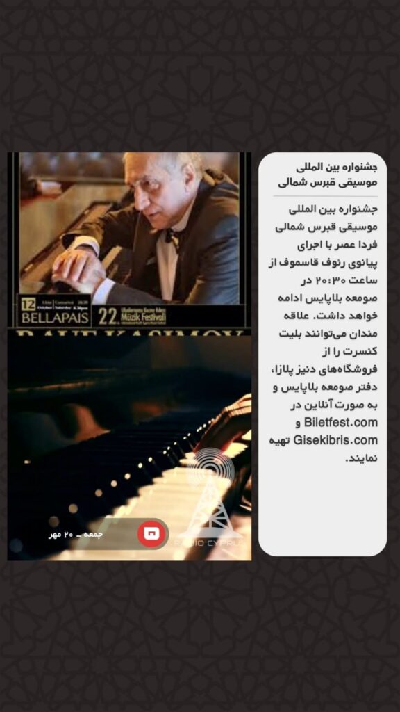 جشنواره بین المللی موسیقی قبرس شمالی فردا عصر با اجرای پیانوی رئوف قاسموف از ساعت ۲۰:۳۰ در صومعه بلاپایس ادامه خواهد داشت. علاقه مندان می‌توانند بلیت کنسرت را از فروشگاه‌های دنیز پلازا، دفتر صومعه بلاپایس و به صورت آنلاین در Biletfest.com و Gisekibris.com تهیه نمایند.