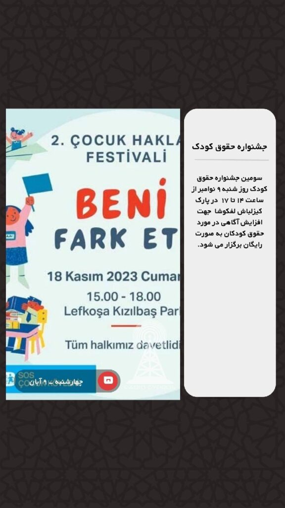 سومین جشنواره حقوق کودک روز شنبه ۹ نوامبر از ساعت ۱۴ تا ۱۷ در پارک کیزلباش لفکوشا جهت افزایش آگاهی در مورد حقوق کودکان به صورت رایگان برگزار می شود.