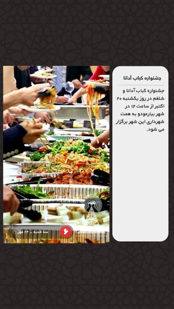 جشنواره کباب آدانا و شلغم در روز یکشنبه ۲۰ اکتبر از ساعت ۱۲ در شهر بیارمودو به همت شهرداری این شهر برگزار می شود.
