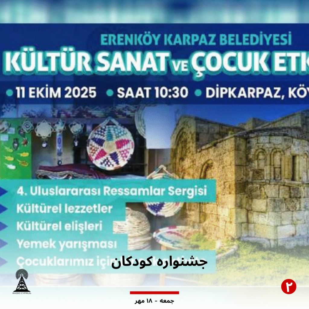 «رویداد فرهنگی-هنری کودکان» که توسط شهرداری ارنکوی-کارپاز برگزار میشود، روز شنبه در میدان روستای دیپکارپاز برگزار خواهد شد. طبق بیانیه شهرداری، این رویداد ساعت ۱۰:۳۰ صبح آغاز میشود و غرفههایی برای نمایش صنایع دستی قبرس، غذاهای محلی و محصولات مختلف برپا شده است.
