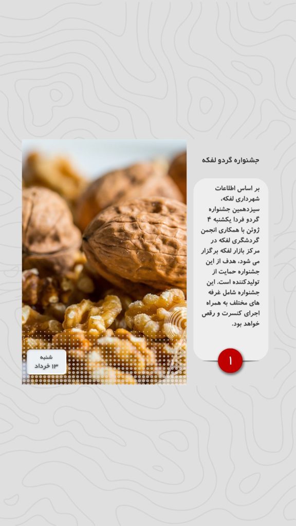 بر اساس اطلاعات شهرداری لفکه، سیزدهمین جشنواره گردو فردا یکشنبه ۴ ژوئن با همکاری انجمن گردشگری لفکه در مرکز بازار لفکه برگزار می شود، هدف از این جشنواره حمایت از تولیدکننده است. این جشنواره شامل غرفه های مختلف به همراه اجرای کنسرت و رقص خواهد بود.