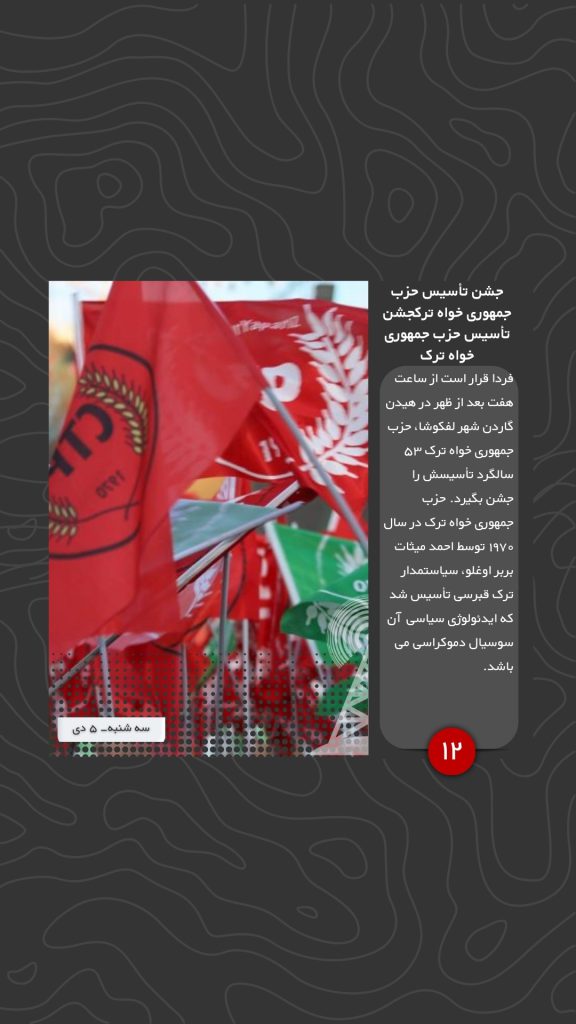فردا قرار است از ساعت هفت بعد از ظهر در هیدن گاردن شهر لفکوشا، حزب جمهوری خواه ترک ۵۳ سالگرد تأسیسش را جشن بگیرد. حزب جمهوری خواه ترک در سال ۱۹۷۰ توسط احمد میثات بربر اوغلو، سیاستمدار ترک قبرسی تأسیس شد که ایدئولوژی سیاسی آن سوسیال دموکراسی می باشد.