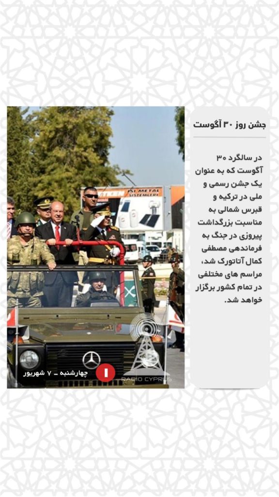 در سالگرد ۳۰ آگوست که به عنوان یک جشن رسمی و ملی در ترکیه و قبرس شمالی به مناسبت بزرگداشت پیروزی در جنگ به فرماندهی مصطفی کمال آتاتورک شد، مراسم های مختلفی در تمام کشور برگزار خواهد شد.