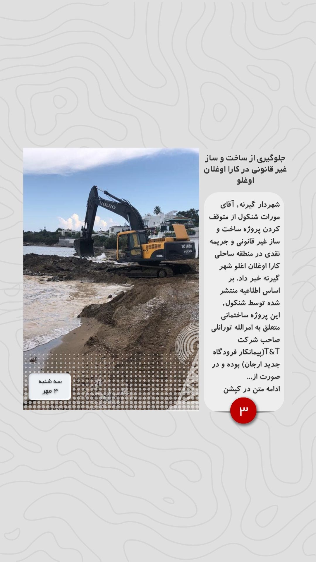 شهردار گیرنه, آقای مورات شنکول از متوقف کردن پروژه ساخت و ساز غیر قانونی و جریمه نقدی در منطقه ساحلی کارا اوغلان اغلو شهر گیرنه خبر داد. بر اساس اطلاعیه منتشر شده توسط شنکول, این پروژه ساختمانی متعلق به امرالله تورانلی صاحب شرکت T&T(پیمانکار فرودگاه جدید ارجان) بوده و در صورت از سرگیری ساخت و ساز برخورد قانونی با پیمانکار و صاحب ملک صورت خواهد پذیرفت.