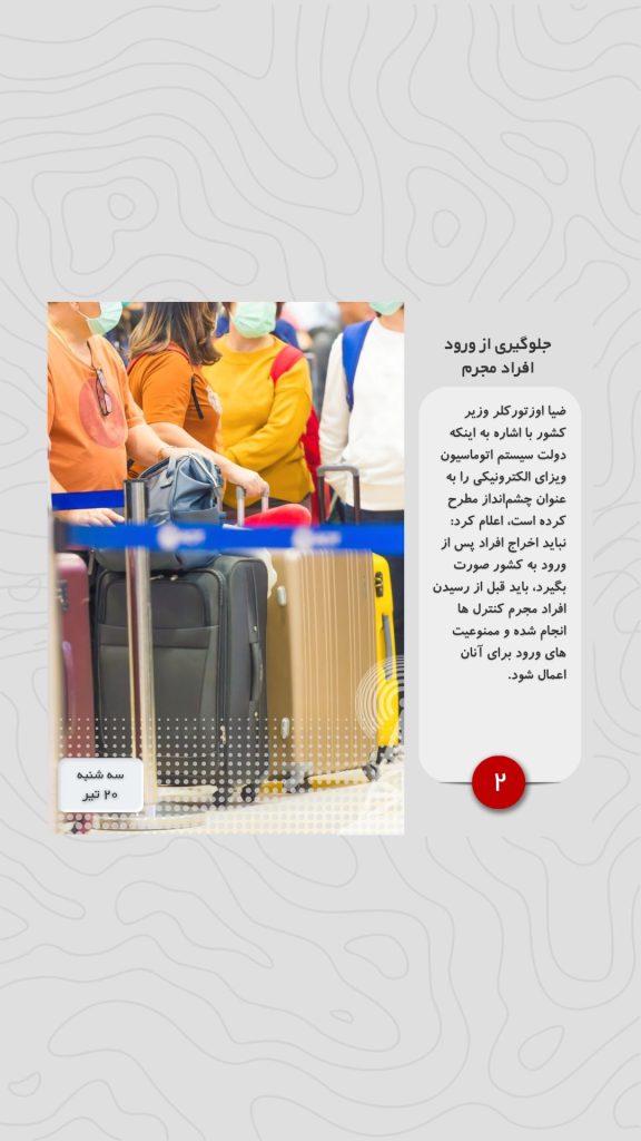 ضیا اوزتورکلر وزیر کشور با اشاره به اینکه دولت سیستم اتوماسیون ویزای الکترونیکی را به عنوان چشمانداز مطرح کرده است، اعلام کرد: نباید اخراج افراد پس از ورود به کشور صورت بگیرد، باید قبل از رسیدن افراد مجرم کنترل ها انجام شده و ممنوعیت های ورود برای آنان اعمال شود.