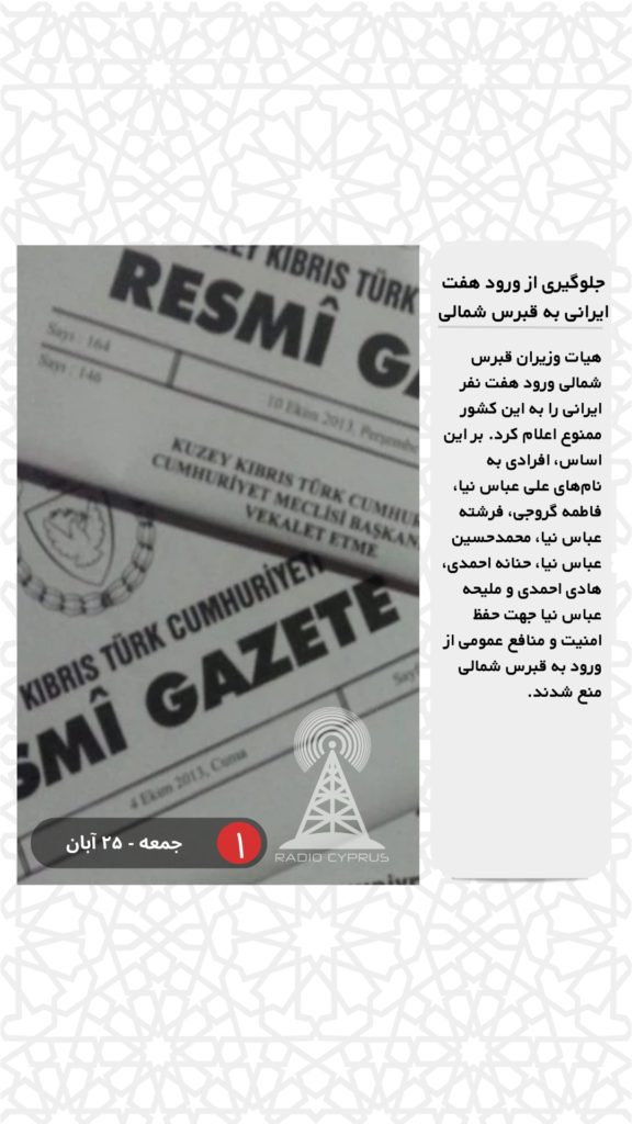 هیات وزیران قبرس شمالی ورود هفت نفر ایرانی را به این کشور ممنوع اعلام کرد. بر این اساس، افرادی به نامهای علی عباس نیا، فاطمه گروجی، فرشته عباس نیا، محمدحسین عباس نیا، حنانه احمدی، هادی احمدی و ملیحه عباس نیا جهت حفظ امنیت و منافع عمومی از ورود به قبرس شمالی منع شدند.