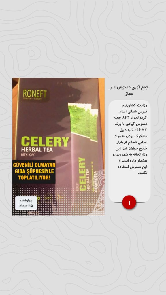 وزارت کشاورزی قبرس شمالی اعلام کرد: تعداد ۸۴۴ جعبه دمنوش گیاهی با برند CELERY به دلیل مشکوک بودن به مواد غذایی ناسالم از بازار خارج خواهد شد. این وزارتخانه به شهروندان هشدار داده است از این دمنوش استفاده نکنند.