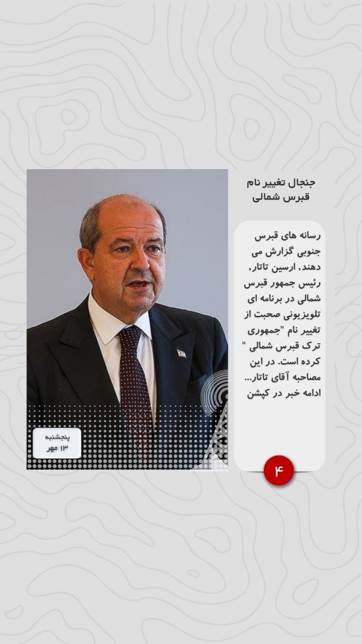 رسانه های قبرس جنوبی گزارش می دهند, ارسین تاتار, رئیس جمهور قبرس شمالی در برنامه ای تلویزیونی صحبت از تغییر نام “جمهوری ترک قبرس شمالی ” کرده است. در این مصاحبه آقای تاتار هرگونه تغییر نام این کشور را مستلزم تغییر قانون اساسی دانسته که برای اینکار می بایست رفراندوم انجام پذیرد. جنجال تغییر نام قبرس شمالی از روز دوشنبه آغاز شد, زمانی که دِولِت باهچلی, سیاست مدار اهل ترکیه ,جمهوری ترک قبرس شمالی را کشور قبرس خطاب کرده بود.