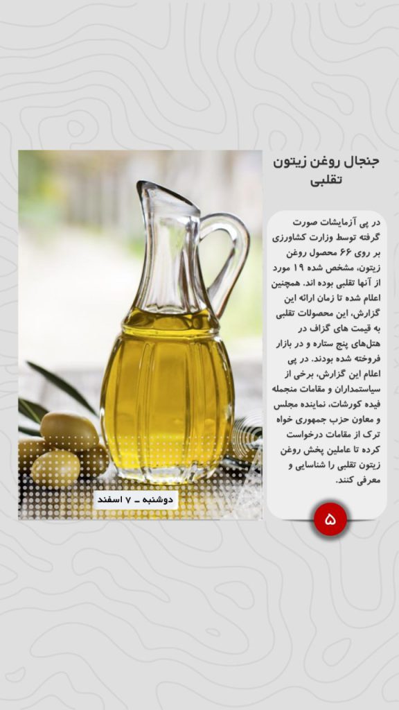 در پی آزمایشات صورت گرفته توسط وزارت کشاورزی بر روی ۶۶ محصول روغن زیتون، مشخص شده ۱۹ مورد از آنها تقلبی بوده اند. همچنین اعلام شده تا زمان ارائه این گزارش، این محصولات تقلبی به قیمت های گزاف در هتلهای پنج ستاره و در بازار فروخته شده بودند. در پی اعلام این گزارش، برخی از سیاستمداران و مقامات منجمله فیده کورشات، نماینده مجلس و معاون حزب جمهوری خواه ترک از مقامات درخواست کرده تا عاملین پخش روغن زیتون تقلبی را شناسایی و معرفی کنند.