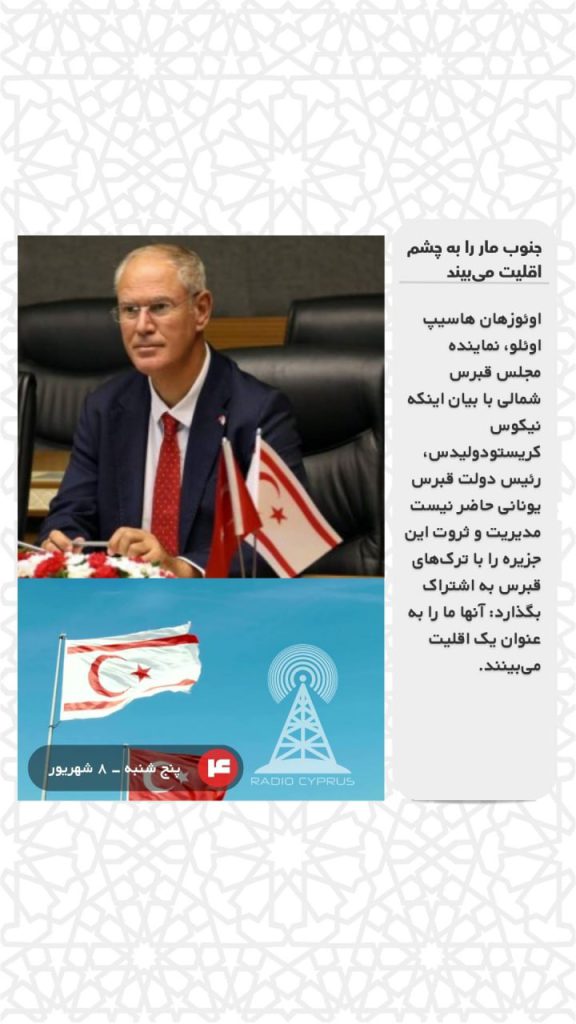 اوئوزهان هاسیپ اوئلو، نماینده مجلس قبرس شمالی با بیان اینکه نیکوس کریستودولیدس، رئیس دولت قبرس یونانی حاضر نیست مدیریت و ثروت این جزیره را با ترکهای قبرس به اشتراک بگذارد: آنها ما را به عنوان یک اقلیت میبینند.