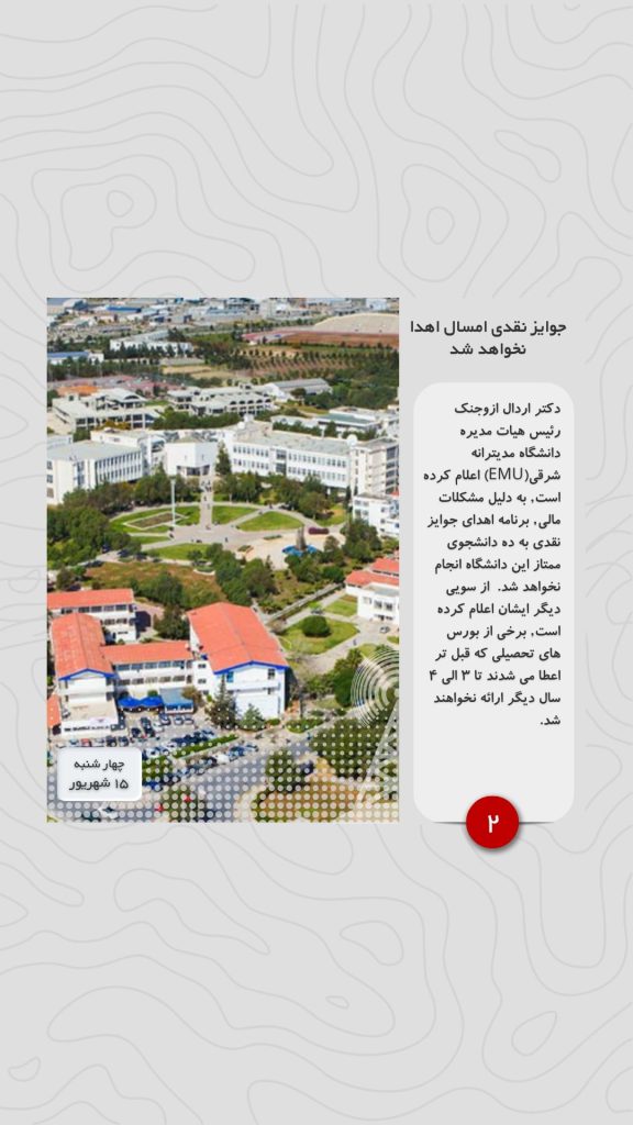 دکتر اردال ازوجنک رئیس هیات مدیره دانشگاه مدیترانه شرقی(EMU) اعلام کرده است, به دلیل مشکلات مالی, برنامه اهدای جوایز نقدی به ده دانشجوی ممتاز این دانشگاه انجام نخواهد شد. از سویی دیگر ایشان اعلام کرده است, برخی از بورس های تحصیلی که قبل تر اعطا می شدند تا ۳ الی ۴ سال دیگر ارائه نخواهند شد.